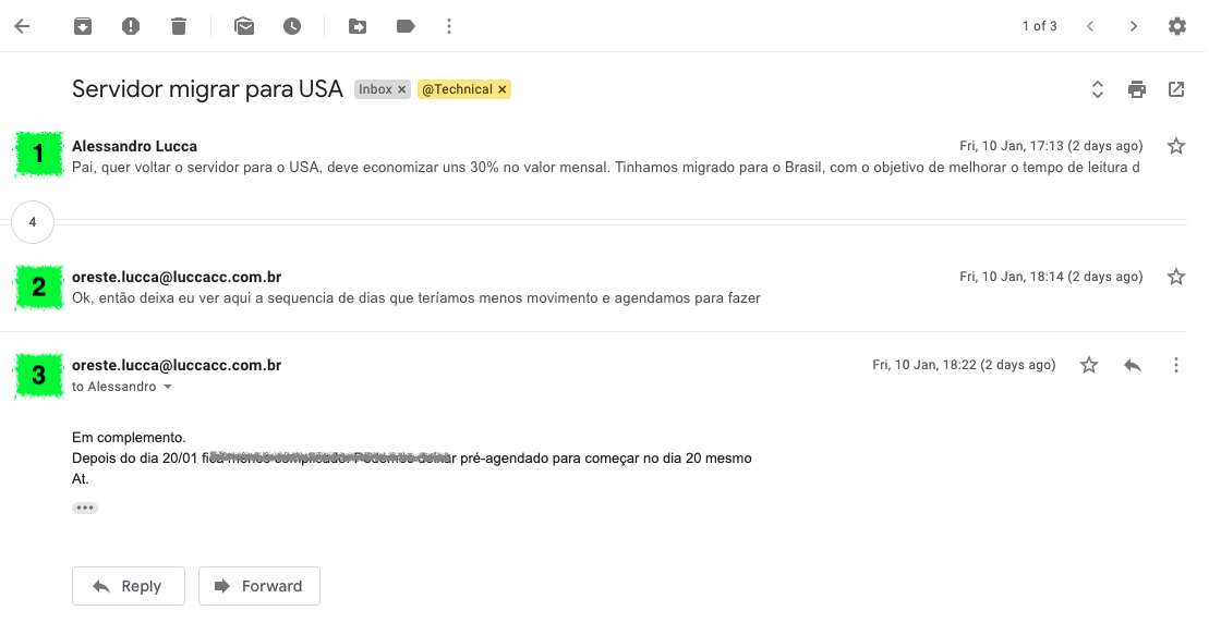 Ao abrir email agrupado por conversa "Servidor migrar para USA" ...