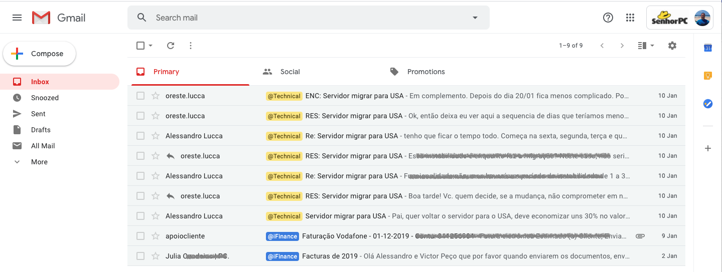 Caixa de entrada sem recurso de conversas: 9 emails em minha caixa de entrada, sendo que, da conversa "Servidor migrar para USA" só preciso do email mais recente.