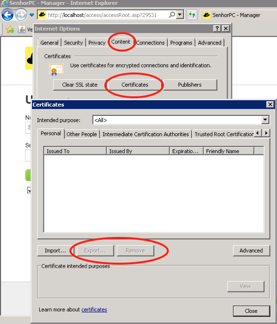 - Ir ao opções do Internet explorer, conteúdo, certificados e excluir todos os certificados, exceto o que deseja cadastrar. ATENÇÃO: precisa importar os certificados depois novamente, tenha certeza de ter backup/arquivo original para importar.